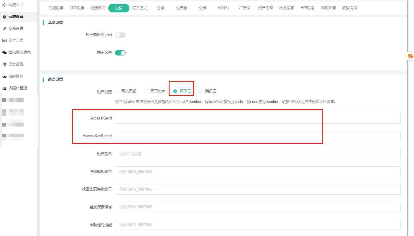 7、将获取到的AccessKey和AccessKeySecret参数信息对应填写到商城后台系统--商城设置--短信“阿里云”下即可。