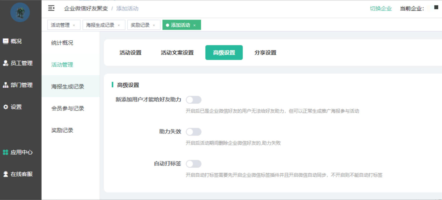 ①新添加的用户才能给好友助力:开启后,只有首次添加该企业成员的会员,才能助力成功;如果添加过该企业成员,删除后重新添加则不能助力。