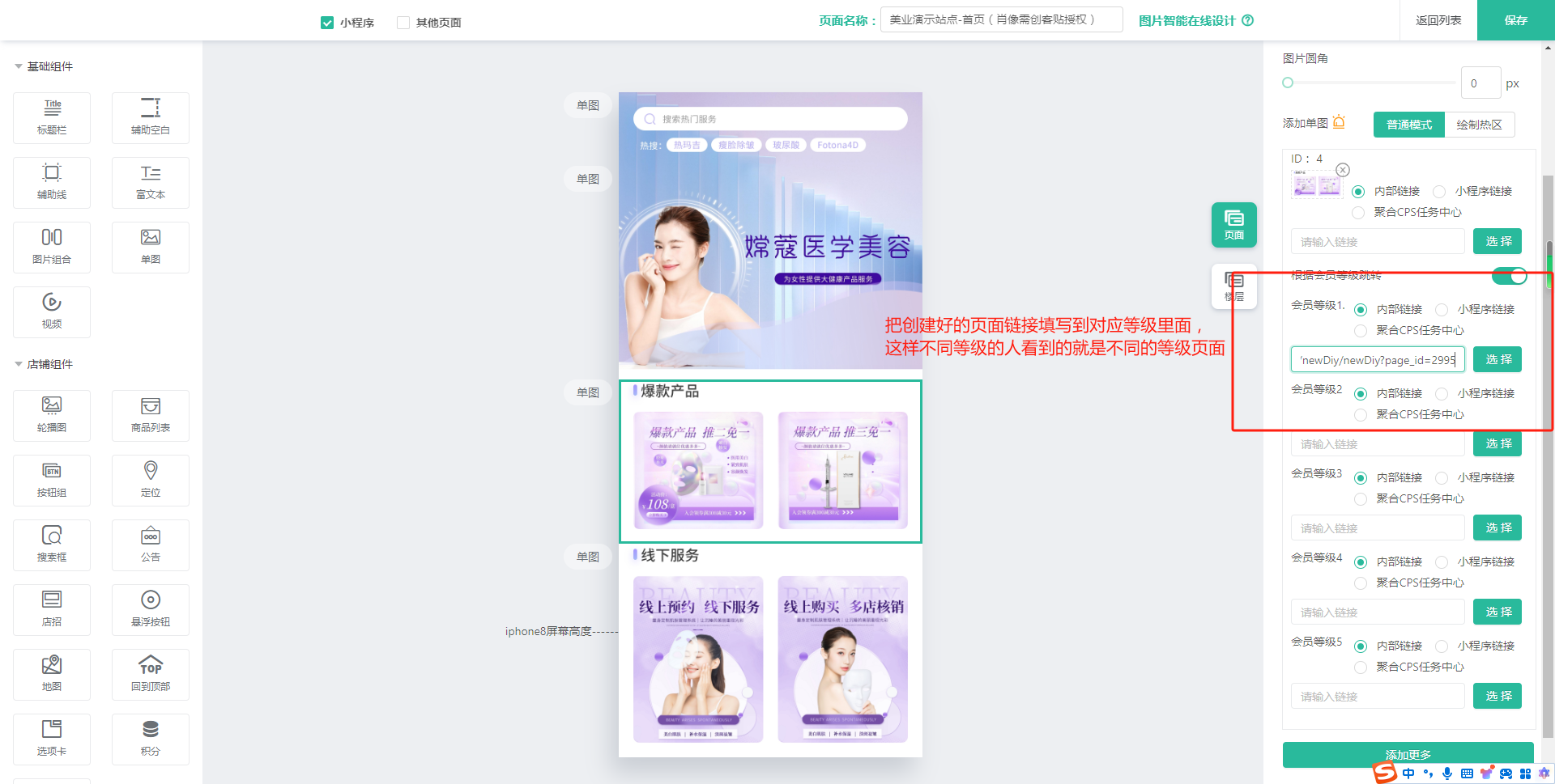 把创建好的页面链接填写到对应等级里面,这样不同等级的人看到的就是不同的等级页面首页创建一个单图页面